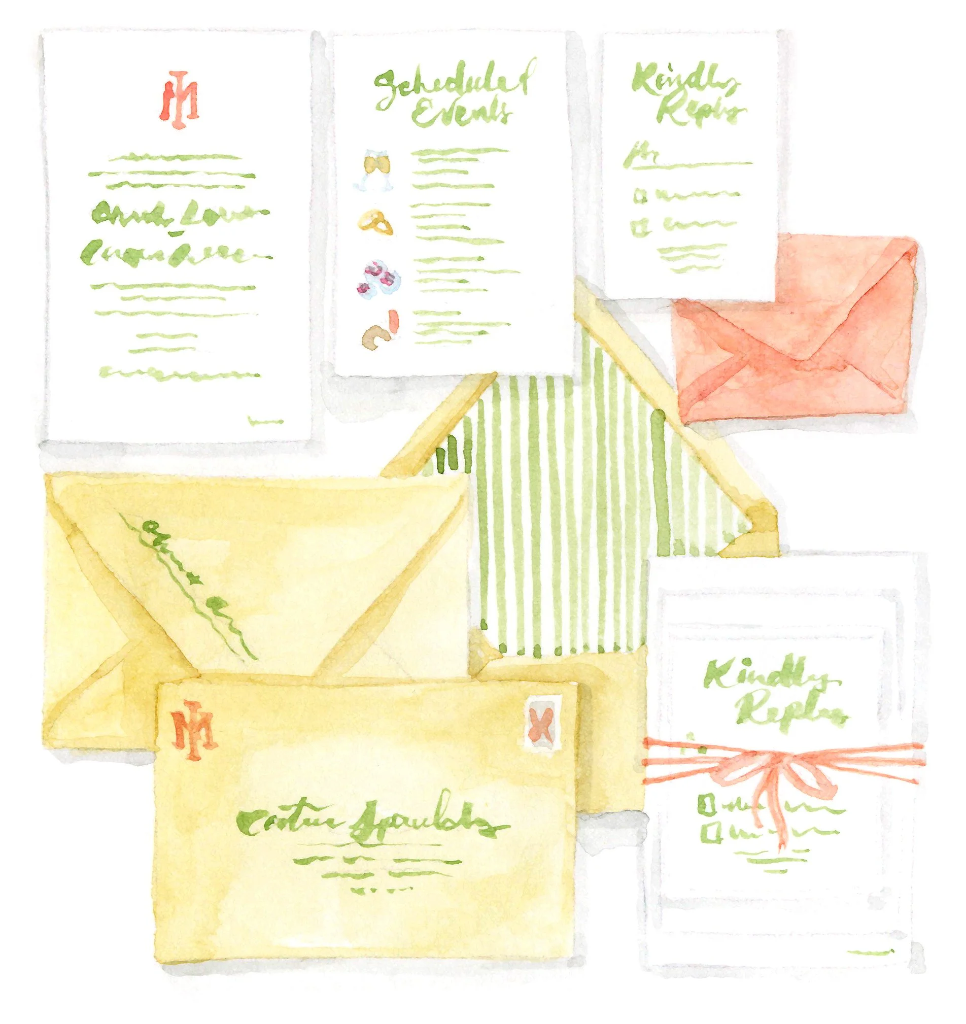 While we really want to receive a carrier pigeon in the mail holding a tiny scroll, filling out an inquiry form on our website is the best way start correspondance with our team and get the process rolling. Once you submit an inquiry form, we’ll respond in a day or two with information and pricing. At this point, if you love what you’ve seen, and you’re ready to move forward, we’ll set up a virtual meeting! We are fully booked each year with custom and semi-custom stationery clients, so if you are interested in working with us, reach out early to guarantee your spot on the calendar! Looking for some early pricing details? Check here for semi-custom and here for custom design details and pricing info.